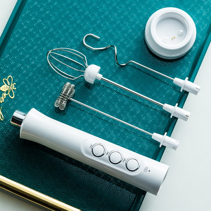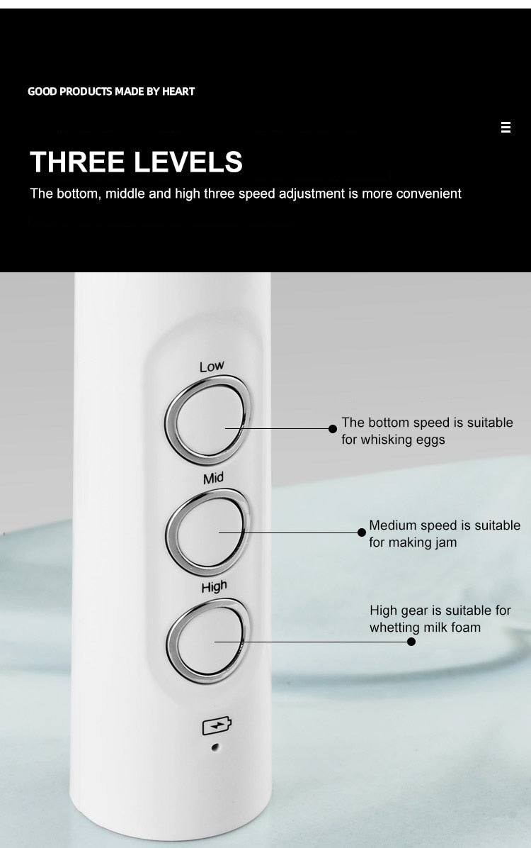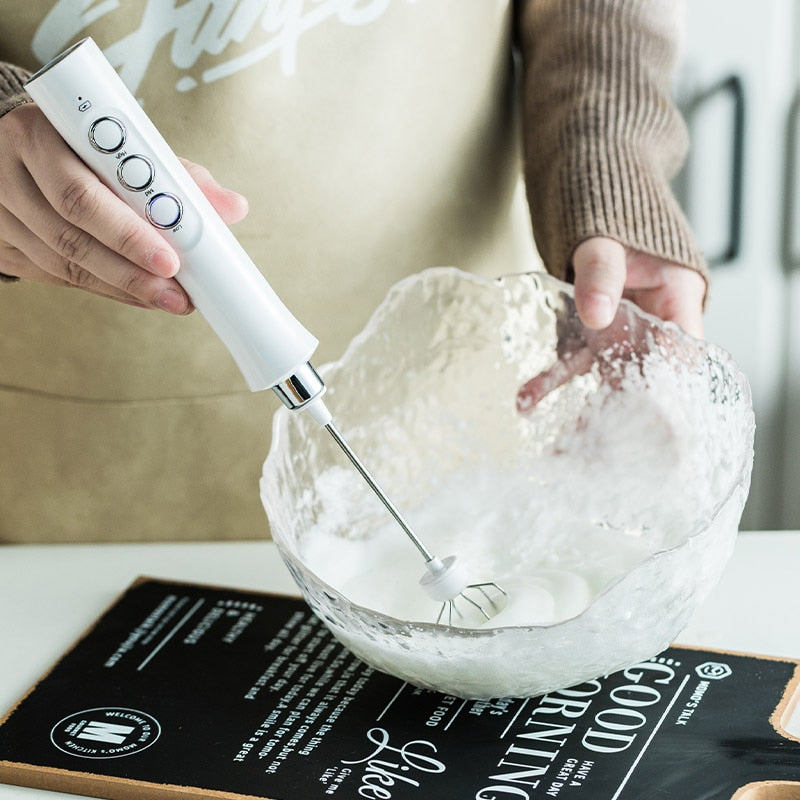 Equipped with a powerful built-in battery of 1200 mAh, this whisk is rechargeable and portable. The charging process is simple, with a full charge indicated by a green light and charging indicated by a red light.