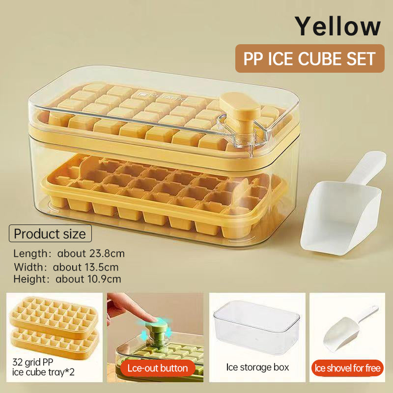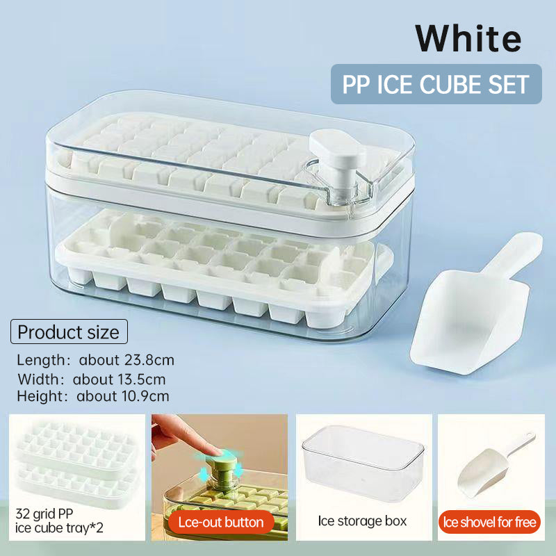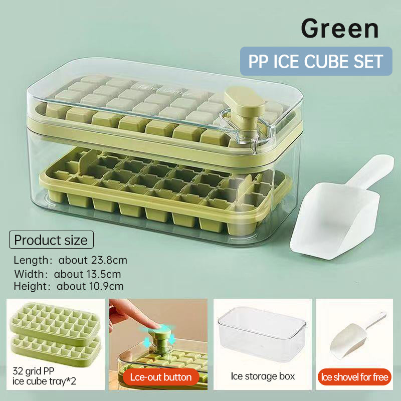 Package: The package contains two 32pcs green ice trays, a clear container and clear lid, and an ice scoop. You can store the ice cubes with the transparent container.