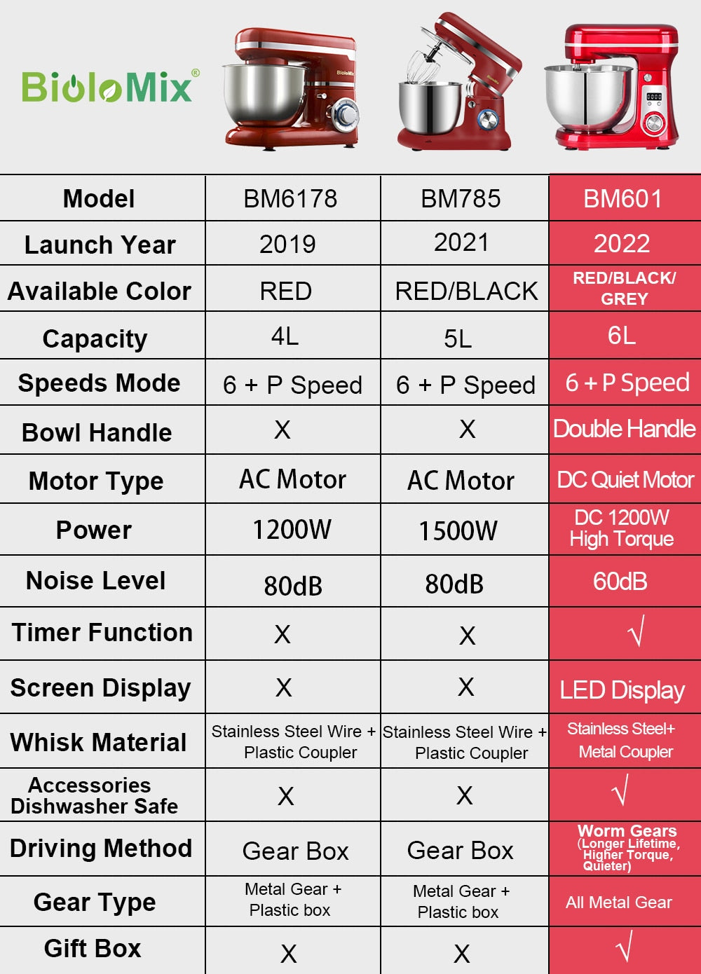 BioloMix Kitchen Food Stand Mixer, Blender, Quiet Motor, Cream Egg Whisk, Whip Dough Kneader, 6-Speed, 1200 W, 6 L, DC