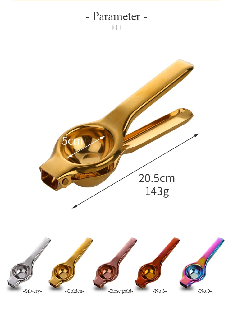 This lemon squeezer is available in various colors, including silver, gold, rose gold, and rainbow no.0/no.3. The sleek and stylish design makes it suitable for use in tabletop settings, kitchens, and restaurants. Its compact size and lightweight construction make it easy to handle and store.