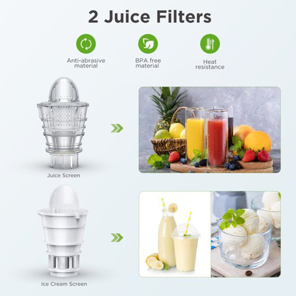 Not worried about clogging while making your cold press juicer. Anti-drop Founction, no juice wasted and no table cleaning required after your juiciing process.