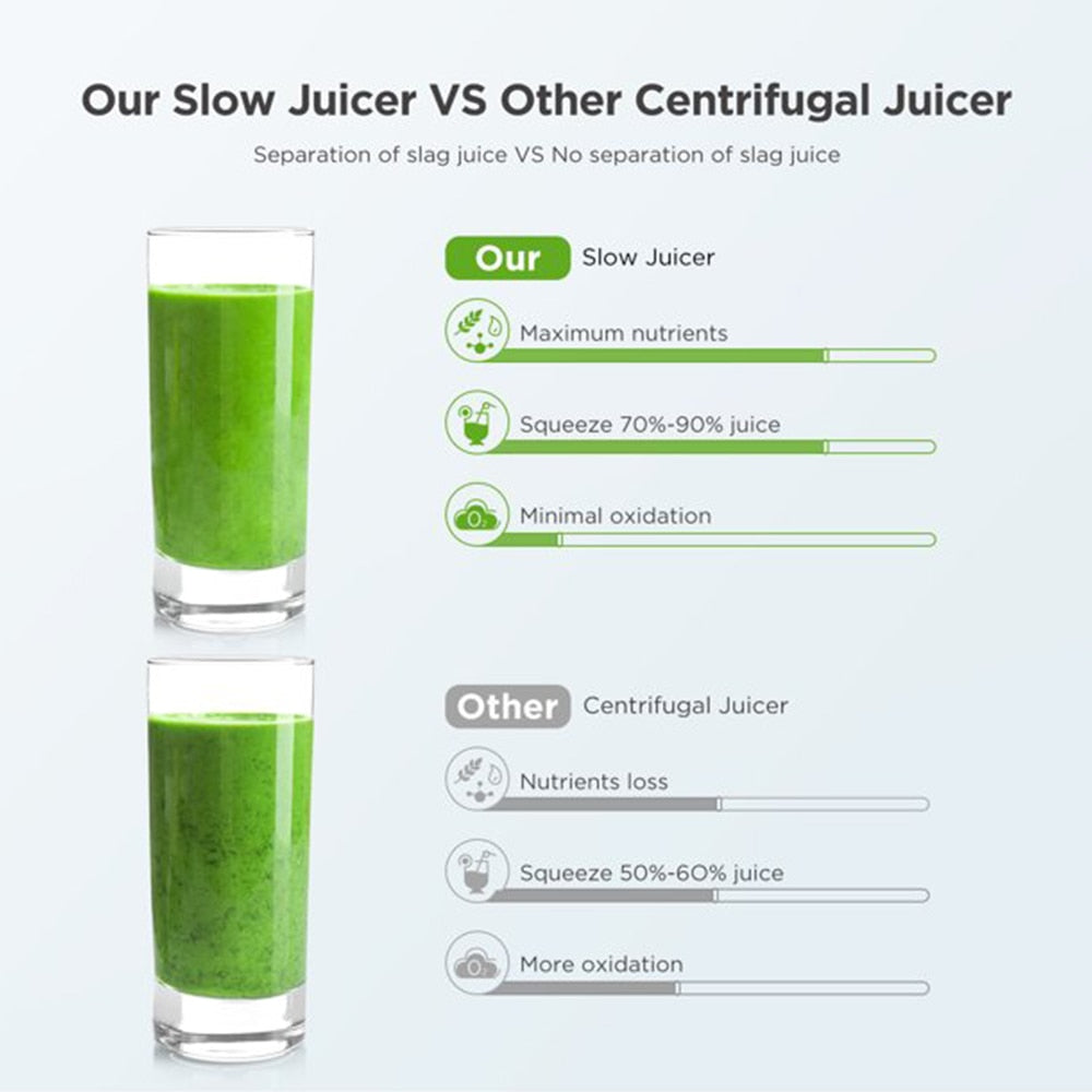 70RPM slow masticating and grinding, without too much heat and friction, extracting higher-purity juice and preserving higher nutritional value with less foaming, give your baby a health and quiet life while enjoying making juice.